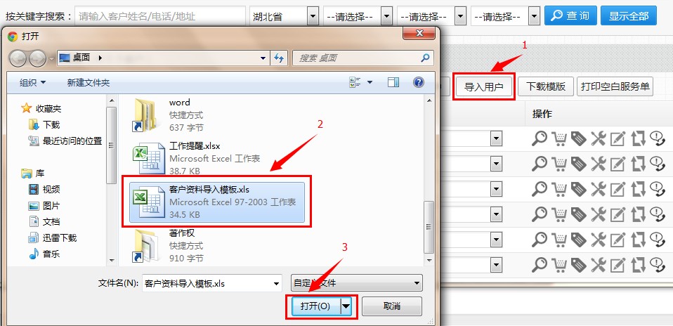 第三步:在“客户资料”列表页面点击“导入用户”,选择已整理好的“客户资料导入”文件,点击打开即可导入。导入过程可能会比较慢,与资料多少有关,但最长不会超过3分钟,一旦出现长时间等待可能与表格填写内容有关,或表格结构被修改有关,请您仔细检查,或直接寻求客服的帮助。另外360安全浏览器也会出现此类问题,请避免使用360安全浏览器使用导入导出功能;
