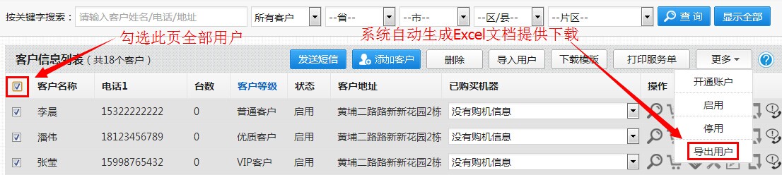 “导出用户”则只用勾选需要导出的客户资料,如下图,然后点击“导出用户”即可获得Excel文件,但此文件和导入模板一样,仅有客户基础信息和购机信息。