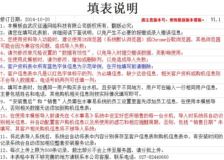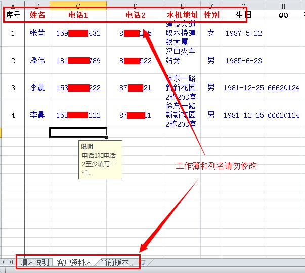 第二步:将您的客户资料和相应购机记录按照模板格式填入模板内,为避免导入失败,模板格式,包括表结构和工作簿名称请勿改动;