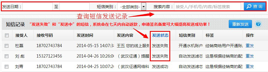 失败的短信重新发送后,系统会更新短信发送状态,但不包括发送成功的记录,成功发送记录,点重发后,系统会直接新增一条发送记录。