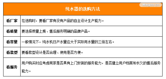 不同地区的水质硬度不同,选购带离子交换树脂滤芯的高级过滤净水器;水中含氯、异色异味较重,选购活性炭载量较多的家用净水器;水中污染严重,要求彻底滤除水中细菌、病毒、异色异味、农药、重金属和其它杂质,不需加热直接饮用的,应选购反渗透纯水机。