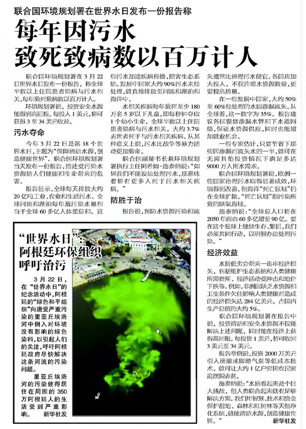 剪报图片:每年因无水致死致病数以百万计人