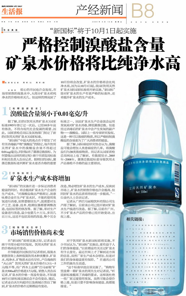 剪报图片:严格控制溴酸盐含量矿泉水价格将比纯净水高