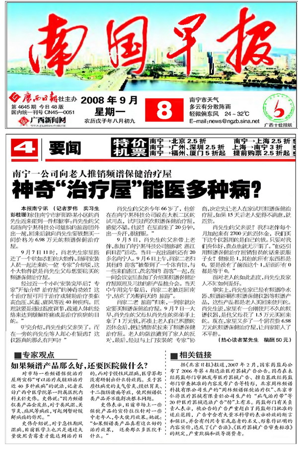 剪报图片:南国早报 频谱神奇治疗屋 能治多种病